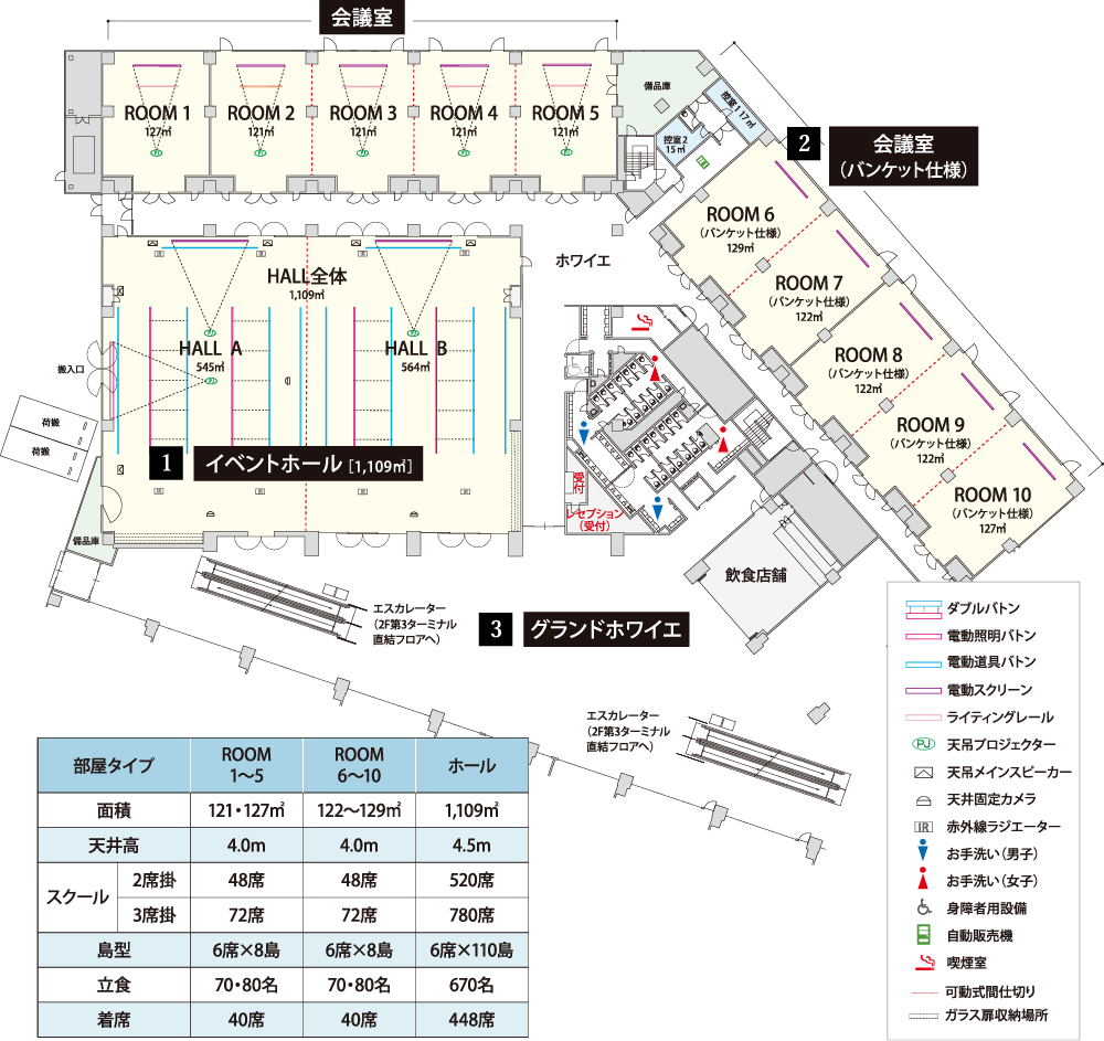 | Room5+6+7 | 396㎡ | 3.7m | 152席 | 228席 | 90席(15島) | 90席(15島) | 120席(15卓) | 180名 |