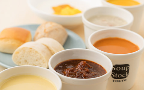 『Soup Stock Tokyo』 のスープをお好きなだけどうぞ。素材にこだわった美味しいパンと共にお楽しみください。