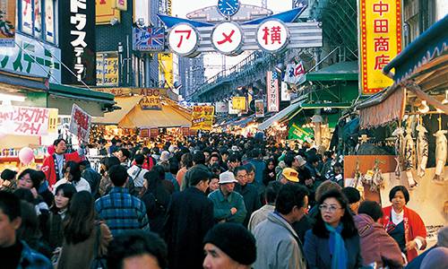 JR上野駅から御徒町駅の高架橋下周辺に激安店がひしめく商店街。生鮮食品からファッション、コスメ、雑貨まで約400店舗が軒を連ね、多くの人で賑わいます。